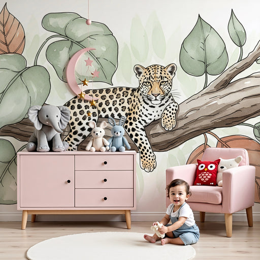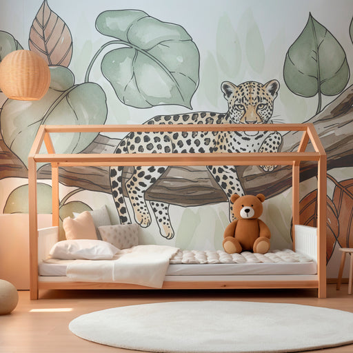 KidsWallAdjon egy dzsungelhangulatot a gyermekszobához ezzel a gyerekszoba tapétával, melyen egy nyugodt leopárd pihen egy ágon. A dús levelek és a lágy sz...
