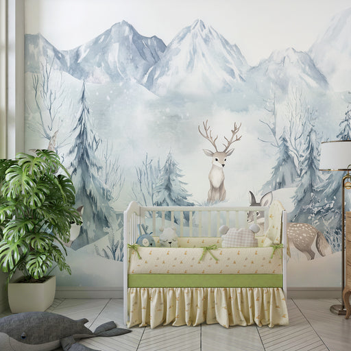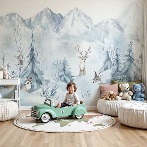 Afficher tous les détailsGyerekszoba tapéta | Hóborította erdő állatokkal és kékes hegyekkel