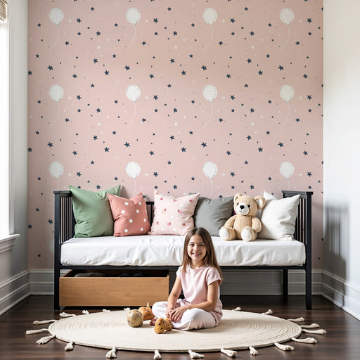 KidsWallVigyen egy ünnepi hangulatot gyermekének szobájába ezzel a vidám tapétával, melyet rózsaszín léggömbök és csillogó kis csillagok díszítenek. Ez a p...