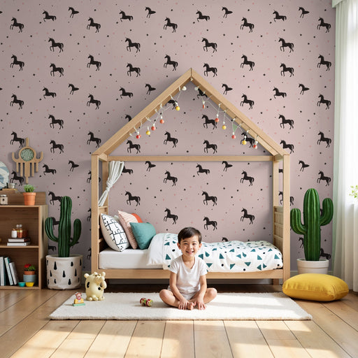 KidsWallAdj hozzá egy kis varázslatot gyermeked szobájához ezzel a gyermekszoba tapéta-val, melyet aranyos fekete unikornisok díszítenek egy puha rózsaszín...