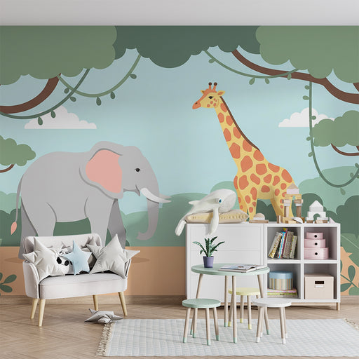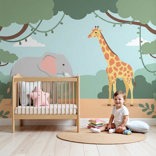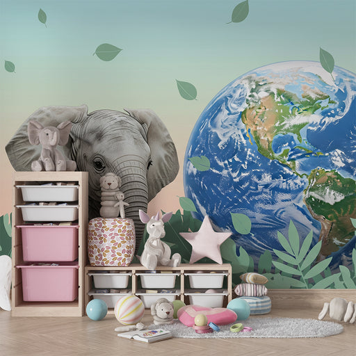 Gyermekszoba tapéta mintákkal | Elefántok a szavannán puha levelekkel