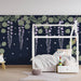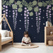 Trasforma la camera del tuo bambino in un nido di dolcezza con questa carta da parati per bambini delicatamente decorata con fiori sospesi e stelle scintillanti. Su uno sfondo scuro, grappoli di fiori lilla e foglie verdi creano un'atmosfera rilassante e sognante, ideale per notti tranquille.