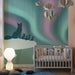 Evoca la magia e la pace dei paesaggi nordici nella camera dei tuoi bambini con questa carta da parati per bambini che rappresenta una famiglia di volpi che contemplano l'aurora boreale. Le tonalità morbide di verde e rosa illuminano il cielo stellato, creando un'atmosfera di sogno e meraviglia.