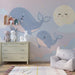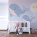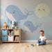 Crea un universo magico e rilassante nella stanza del tuo bambino con la nostra carta da parati balene felici al chiaro di luna. Questo design incantevole mostra balene sorridenti che navigano attraverso nuvole morbide e stellate, sotto una luna benevola.