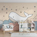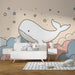 Carta da parati bambini | Balena galleggiante tra le nuvole e le stelle pastello