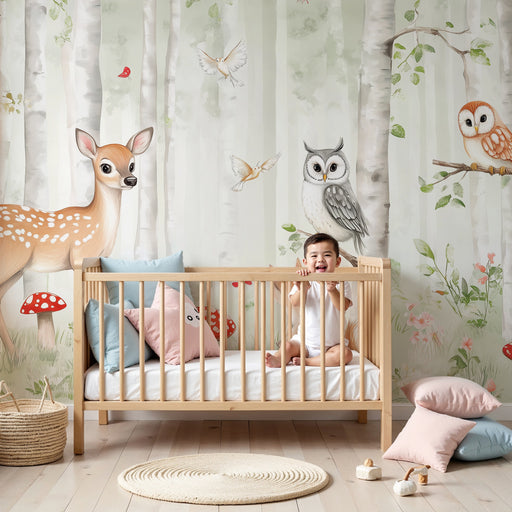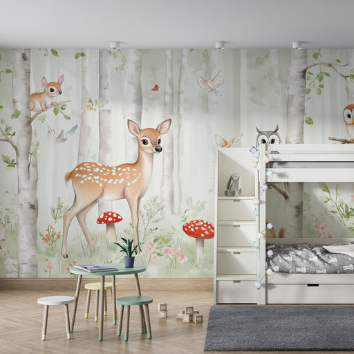 Carta da parati bambini | Foresta incantata con cerbiatti e gufi