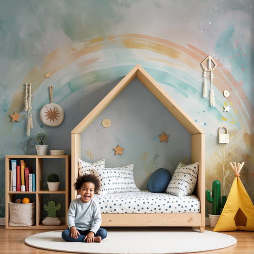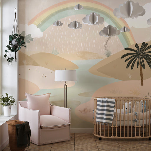 KidsWallImmergiti in un paesaggio tranquillo dove un arcobaleno pastello illumina un scenario desertico delicato. Questa carta da parati bambini crea un'at...