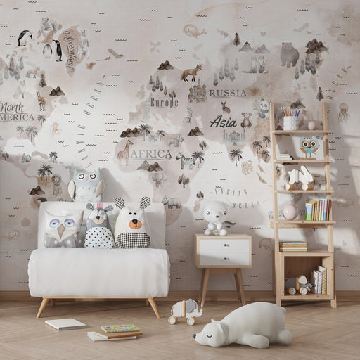 KidsWallChiudi gli occhi e immagina una mappa del mondo dipinta ad acquerello, dove ogni continente prende vita attraverso animali maestosi, paesaggi incan...
