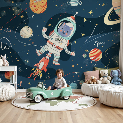 Carta da parati bambini | Gatto astronauta e razzo nello spazio stellato