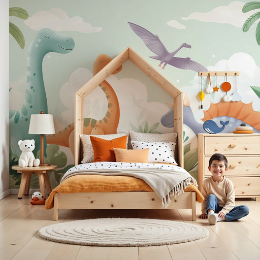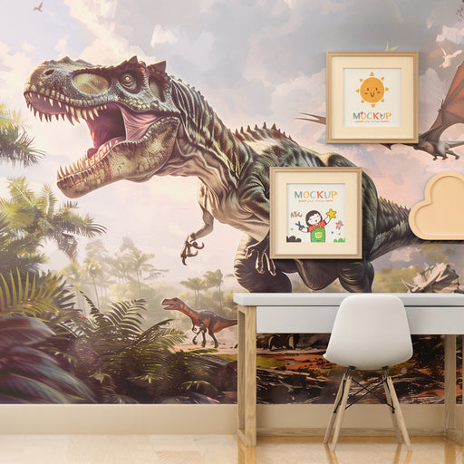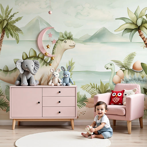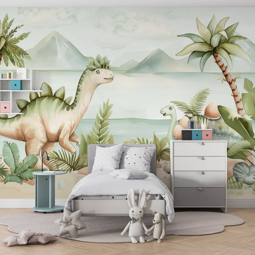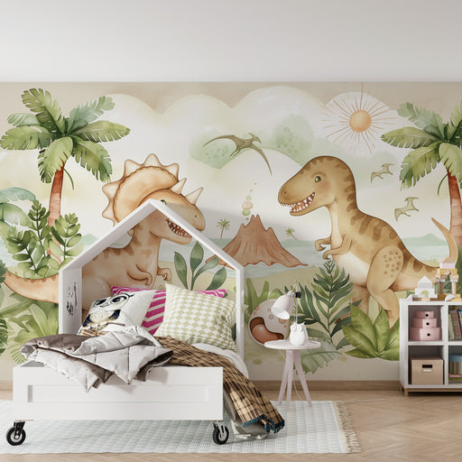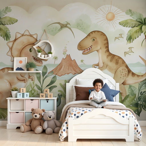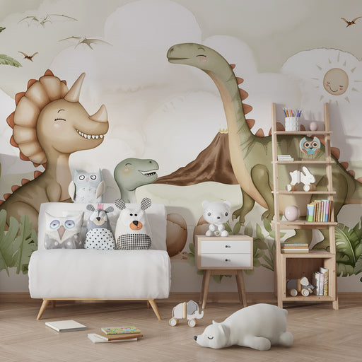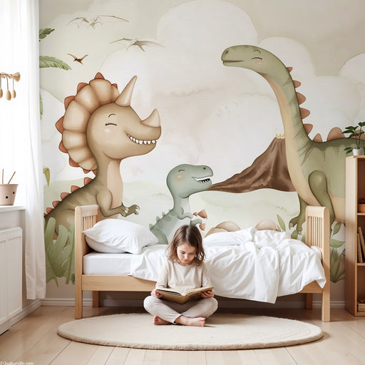 KidsWallImmergi il tuo bambino in un mondo preistorico affascinante con questa carta da parati bambini che evoca un'epoca in cui i dinosauri regnavano sovr...