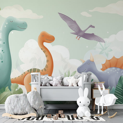 KidsWallOffri a tuo figlio un viaggio nel tempo con questa carta da parati bambini, dove allegri piccoli dinosauri si muovono in un universo dolce e ludico...