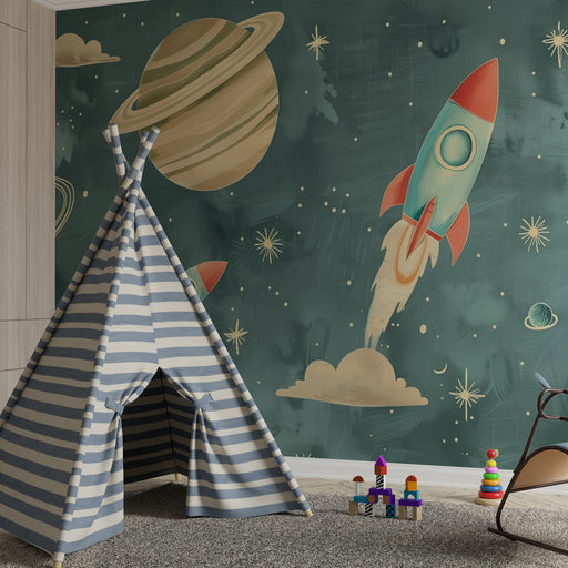 Visualizza tutti i dettagliCarta da parati bambini | Razzi retrò e pianeti in un cielo stellato