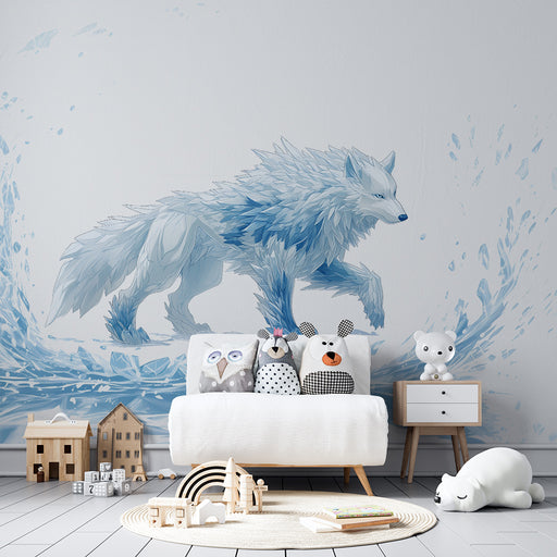 KidsWallTrasforma la camera dei tuoi bambini con la nostra carta da parati lupo artico, che rappresenta un magnifico lupo bianco in mezzo a un'onda gelida....