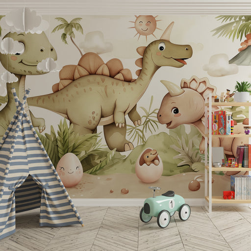 KidsWallTrasforma la camera del tuo bambino in un vero viaggio nel tempo dei dinosauri con questa carta da parati bambini dalle illustrazioni tenere e gioi...