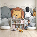 Trasforma la camera del tuo bambino in un universo incantato con questa carta da parati per bambini che mostra adorabili animali emergere dalle nuvole. Un curioso elefante, un amichevole leone, una vivace zebra e una giocosa tigre si nascondono in un mare di nuvole soffici e soffici, creando un'atmosfera giocosa e rassicurante.