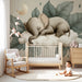 Trasforma la stanza del tuo bambino in un nido di dolcezza con questa carta da parati per bambini che raffigura un adorabile elefante pacificamente addormentato su una nuvola soffice. Circondato da delicate foglie, questo decoro rilassante evoca un universo di sogni e serenità.