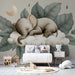 Carta da parati bambini | Elefante addormentato su una nuvola circondato da foglie