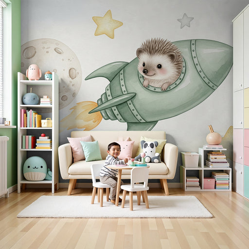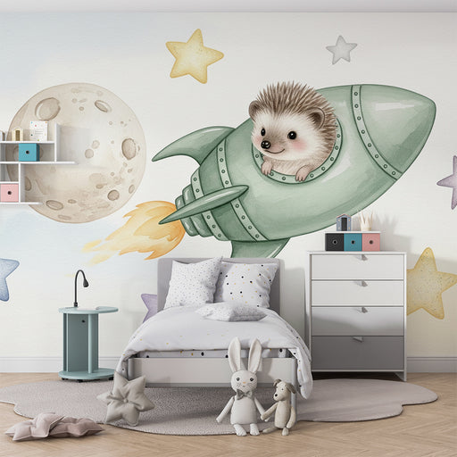KidsWallImbarcati in un'avventura galattica con questa carta da parati per bambini che rappresenta un adorabile riccio astronauta viaggiante a bordo del su...