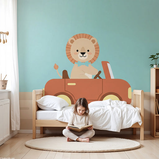 Visualizza tutti i dettagliCarta da parati bambini | Leone avventuriero in macchina
