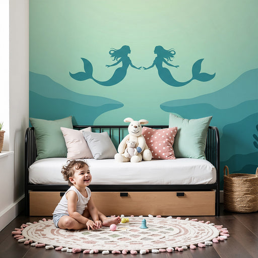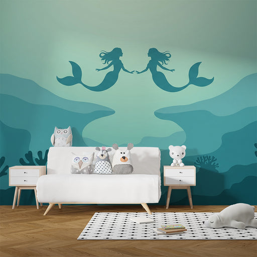 KidsWallImmergiti in un incantevole mondo sottomarino con questa carta da parati per bambini che raffigura due sirene che danzano elegantemente in mezzo al...