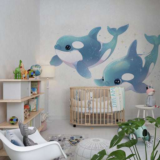 Immergi il tuo bambino nell'universo acquatico con questa carta da parati per la camera dei bambini, dove le maestose orche nuotano in onde dolci. ...