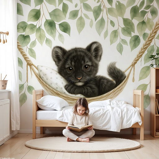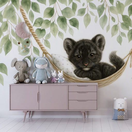 KidsWallCrea un'oasi di pace per il tuo bambino con la nostra carta da parati gattino addormentato in un'amaca frondosa. Questa dolce scena raffigura un ad...