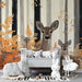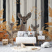 Gli alberi maestosi dai tronchi neri e grigi creano un contrasto sorprendente con le foglie dorate e le felci vibranti, aggiungendo una dimensione calorosa e accogliente alla stanza. Ogni dettaglio, dagli occhi curiosi dei cervi alle delicate texture delle felci, è accuratamente illustrato per catturare l'essenza della natura.