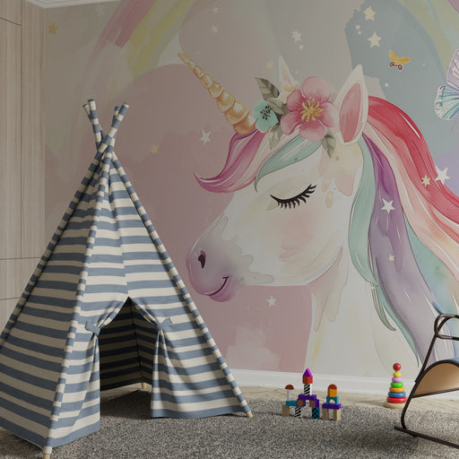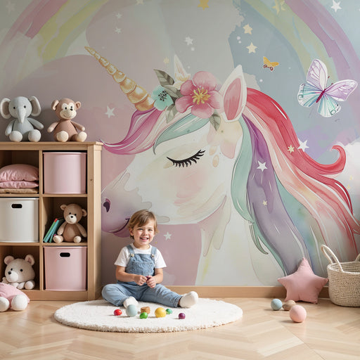 Carta da parati bambini | Unicorno incantato e farfalle pastello