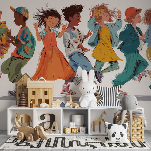 KidsWallQuesta carta da parati per bambini presenta un'illustrazione vivace e colorata di un gruppo di bambini energetici che ballano e si divertono insiem...