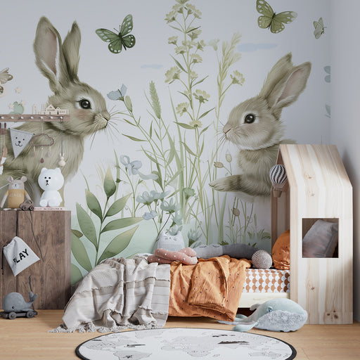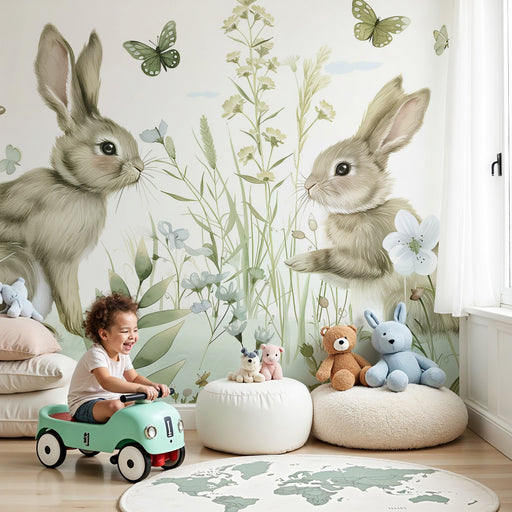 Visualizza tutti i dettagliCarta da parati bambini | Foresta incantata con conigli e farfalle verdi