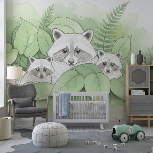 KidsWallPorta un tocco di avventura nella camera dei tuoi bambini con questa carta da parati per bambini che rappresenta una famiglia adorabile di procioni...