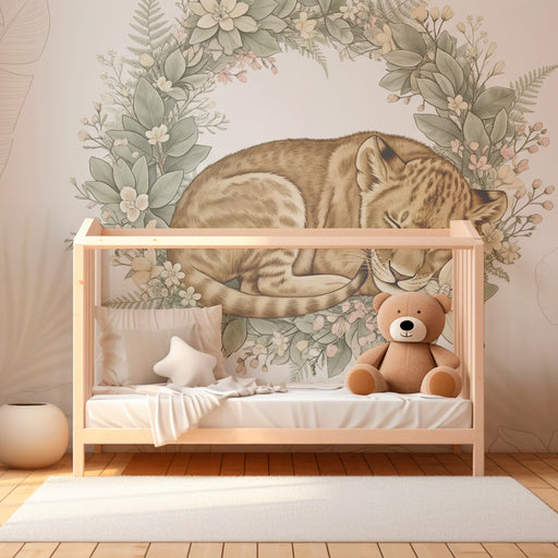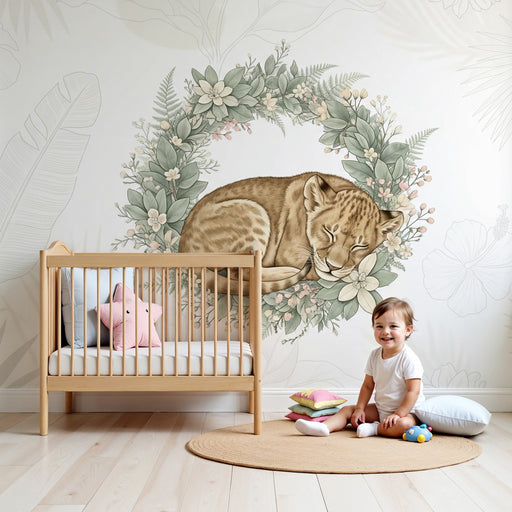 KidsWallRisveglia lo spirito selvaggio del tuo bambino con questa carta da parati per bambini raffigurante un cucciolo di leone addormentato, circondato d...