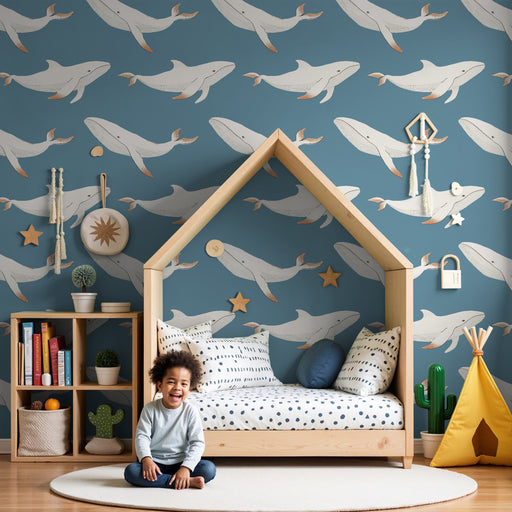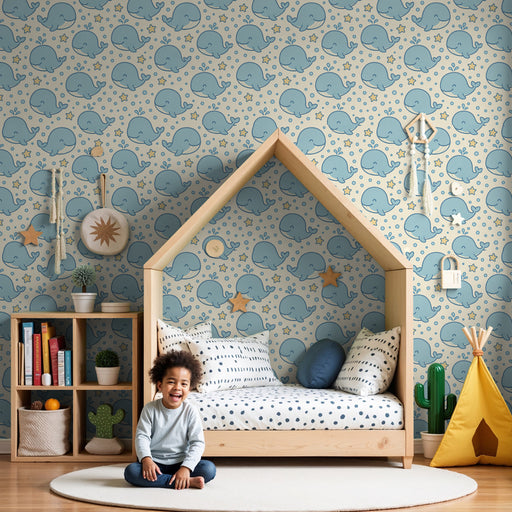 KidsWallTrasforma la camera del tuo piccolo con questa carta da parati adorabile raffigurante balene sorridenti che galleggiano pacificamente su uno sfondo...