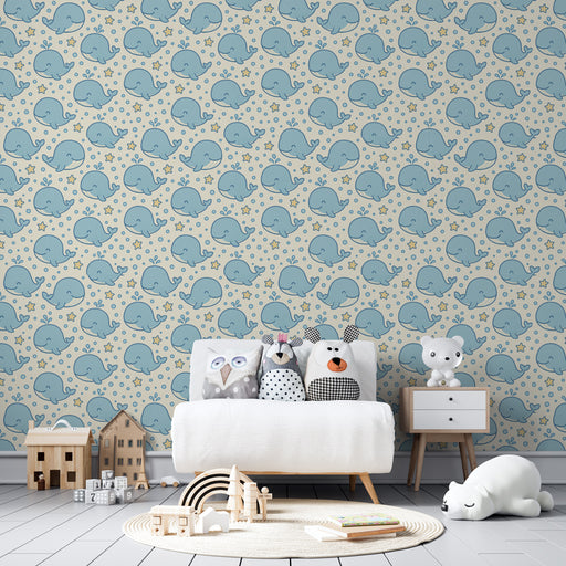 KidsWallTrasforma la camera dei tuoi figli con questa carta da parati affascinante, decorata con piccole balene che nuotano felici su uno sfondo crema morb...