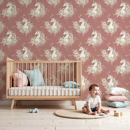 KidsWallTrasforma lo spazio del tuo piccolo con questa carta da parati per camera dei bambini, un incantevole motivo di unicorni direttamente da una fiaba....