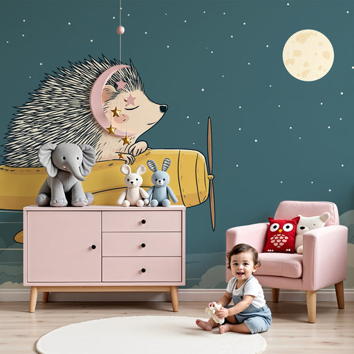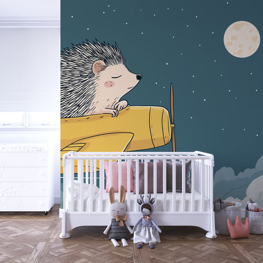 KidsWallImbarcati in un'avventura magica nella camera del vostro bambino con questa carta da parati per bambini raffigurante un simpatico riccio che pilota...