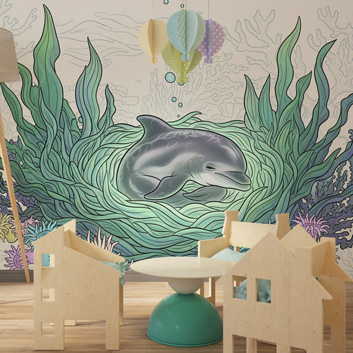 KidsWallImmergiti nell'affascinante mondo dell'oceano con questa carta da parati per bambini che mostra un adorabile delfino che si riposa tra le alghe. Ac...