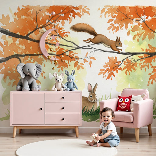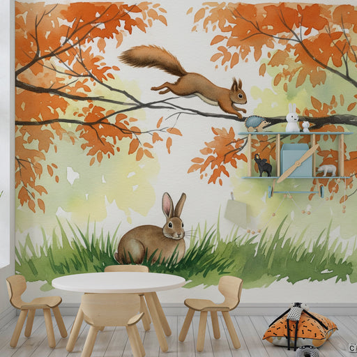 KidsWallTrasforma la camera dei tuoi bambini in un'oasi di pace con questa carta da parati per bambini che rappresenta uno splendido scoiattolo in una fore...