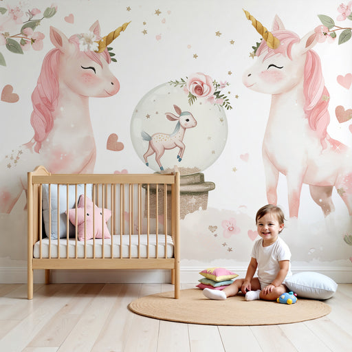 Visualizza tutti i dettagliCarta da parati bambini | Unicorni sognanti e dolcezza floreale