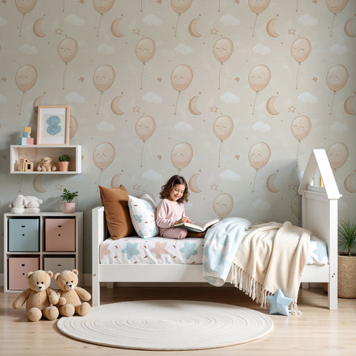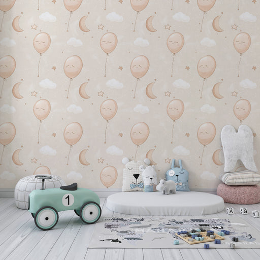 KidsWallTrasforma lo spazio del tuo bambino con questa carta da parati affascinante, dove palloncini sorridenti danzano con soffici nuvole, rilassanti lune...