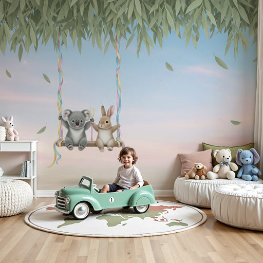 Carta da parati bambini | Piccola altalena con un koala e un coniglio
