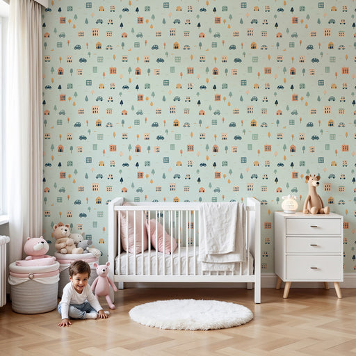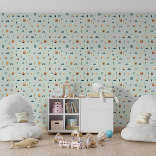 KidsWallTrasforma la camera dei tuoi figli in un piccolo angolo di città con questa carta da parati per la camera dei bambini. Decorato con case colorate e...