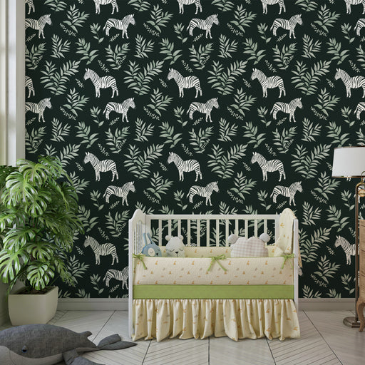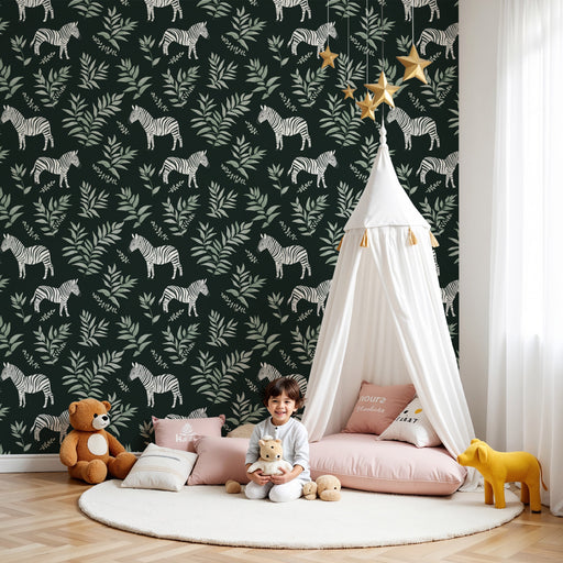 KidsWallTrasforma la camera del tuo piccolo con questa carta da parati ingannevole che rappresenta eleganti zebre che si muovono tra lussureggianti fogliam...