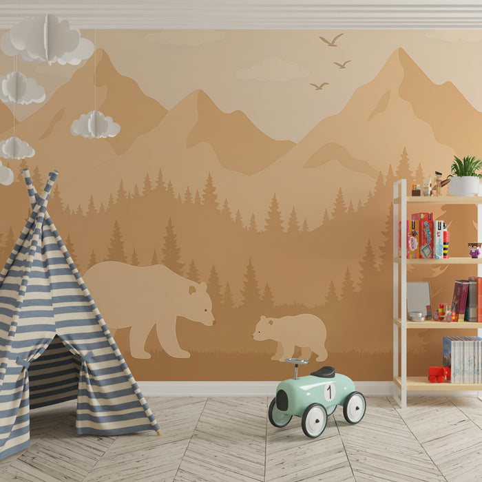 Trasforma la camera del tuo bambino con questa carta da parati ispirata alla natura, dove un maestoso orso e il suo cucciolo prosperano in un paesaggio incantevole. Le tonalità tenui del beige e del caramello evocano il calore di una foresta sullo sfondo montuoso, creando un'atmosfera serena e confortante.