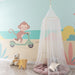 Aggiungi un tocco di gioia e avventura alla camera del tuo bambino con questa carta da parati per bambini che rappresenta una simpatica scimmia che si diverte sul suo monopattino in riva al mare. Questo decoro colorato evoca giornate soleggiate piene di risate e scoperte.