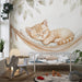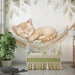 Porta un tocco di dolcezza e tranquillità al tuo spazio con il nostro carta da parati gattino addormentato. Questo design rilassante presenta un adorabile gattino rosso comodamente sdraiato in un'amaca, circondato da delicate foglie.
