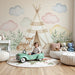 Transformeer de kamer van uw baby in een gezellige ruimte met dit babykamerbehang met een charmante tent en een schattig hert. De pastelkleuren van de wolken voegen een vleugje zachtheid toe, waardoor een rustige en dromerige sfeer ontstaat.