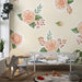 De crèmekleurige achtergrond accentueert de bloemmotieven en voegt een vleugje warmte en sereniteit toe aan de kamer. Elk detail, van de zachte tinten van de bloemblaadjes tot de delicate bladeren, is ontworpen om een gastvrije en geruststellende sfeer te brengen.