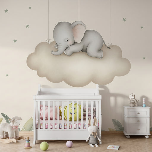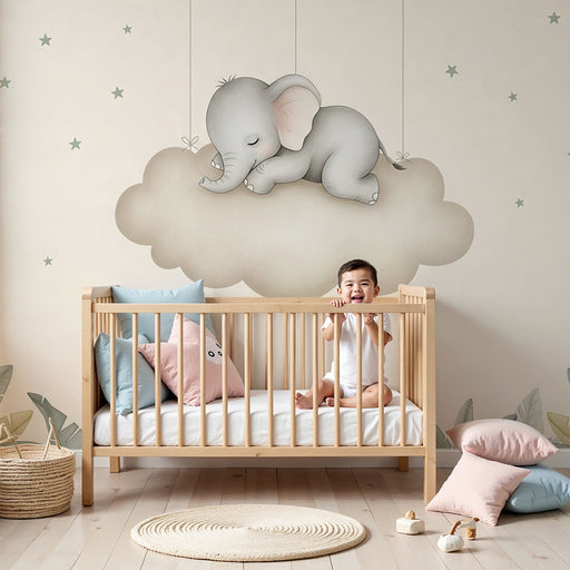 KidsWallTransformeer de kamer van je baby tot een knusse ruimte met dit babykamerbehang met een schattige slapende olifant op een zachte wolk. Dit zachte e...