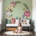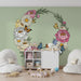 Babykamer behang | Bloemenkrans met kleurrijke vlinders op een zachte groene achtergrond